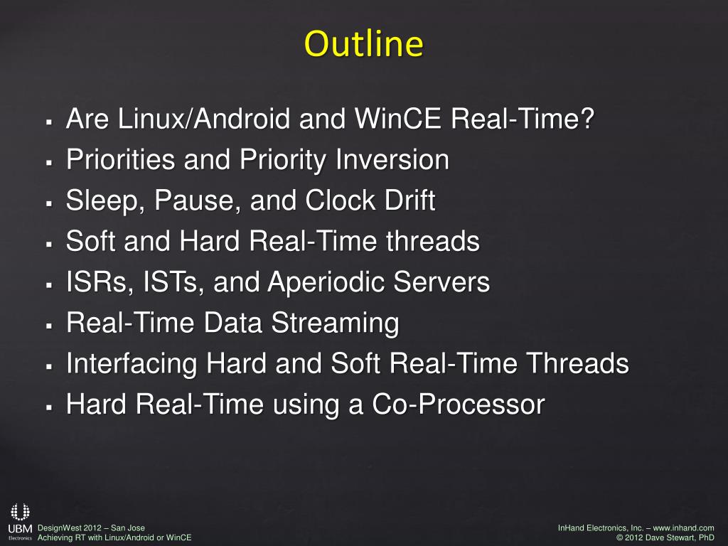 ESC 316. Achieving Real-Time Performance with Linux/Android or Windows CE. Dave Stewart, PhD Director of Research and Systems Integration InHand Electronics dstewart@inhand.com www.inhand.com. Outline. Are Linux/Android and WinCE Real-Time? Priorities and Priority Inversion