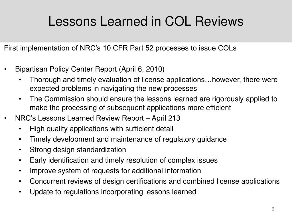 Lessons Learned in COL Reviews • First implementation of NRC’s 10 CFR Part 52 processes to issue COLs • Bipartisan Policy Center Report (April 6, 2010) • Thorough and timely evaluation of license applications…however, there were expected problems in navigating the new processes • The Commission should ensure the lessons learned are rigorously applied to make the processing of subsequent applications more efficient • NRC’s Lessons Learned Review Report – April 213 • High quality applications with sufficient detail • Timely development and maintenance of regulatory guidance • Strong design standardization • Early identification and timely resolution of complex issues • Improve system of requests for additional information • Concurrent reviews of design certifications and combined license applications • Update to regulations incorporating lessons learned
