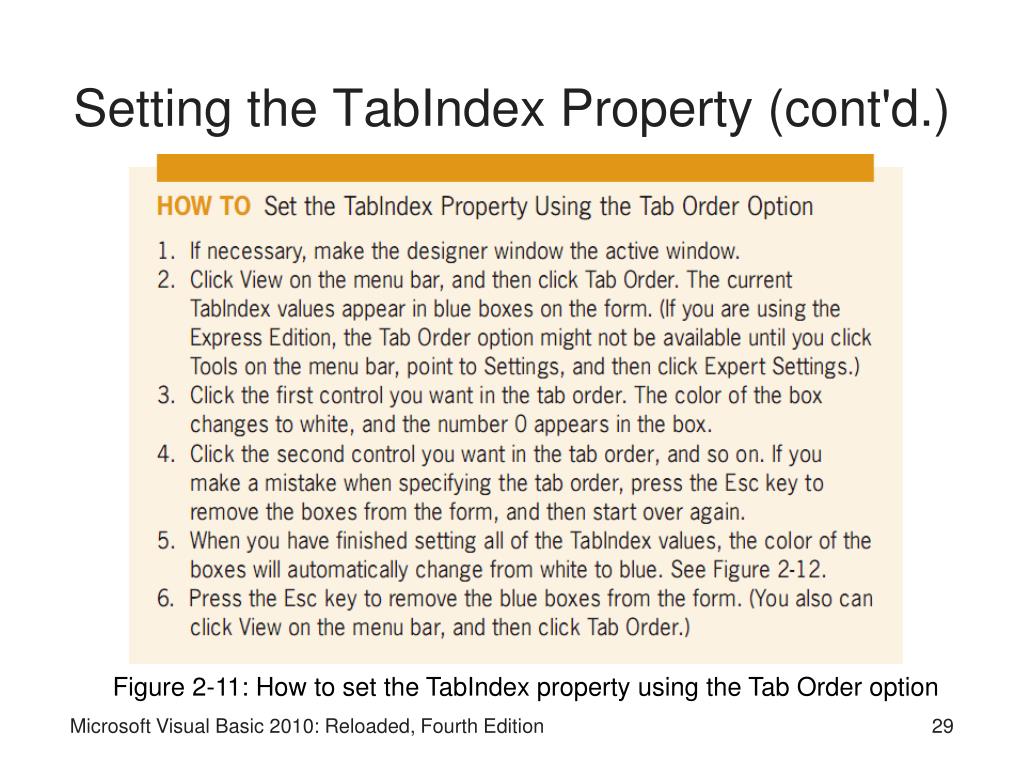Setting the TabIndex Property (cont'd.) Figure 2-11: How to set the TabIndex property using the Tab Order option Microsoft Visual Basic 2010: Reloaded, Fourth Edition