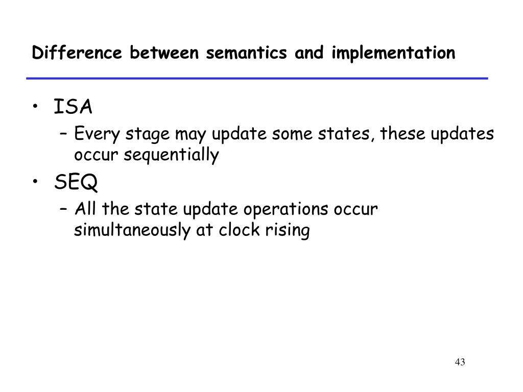 Difference between semantics and implementation • ISA • Every stage may update some states, these updates occur sequentially • SEQ • All the state update operations occur simultaneously at clock rising