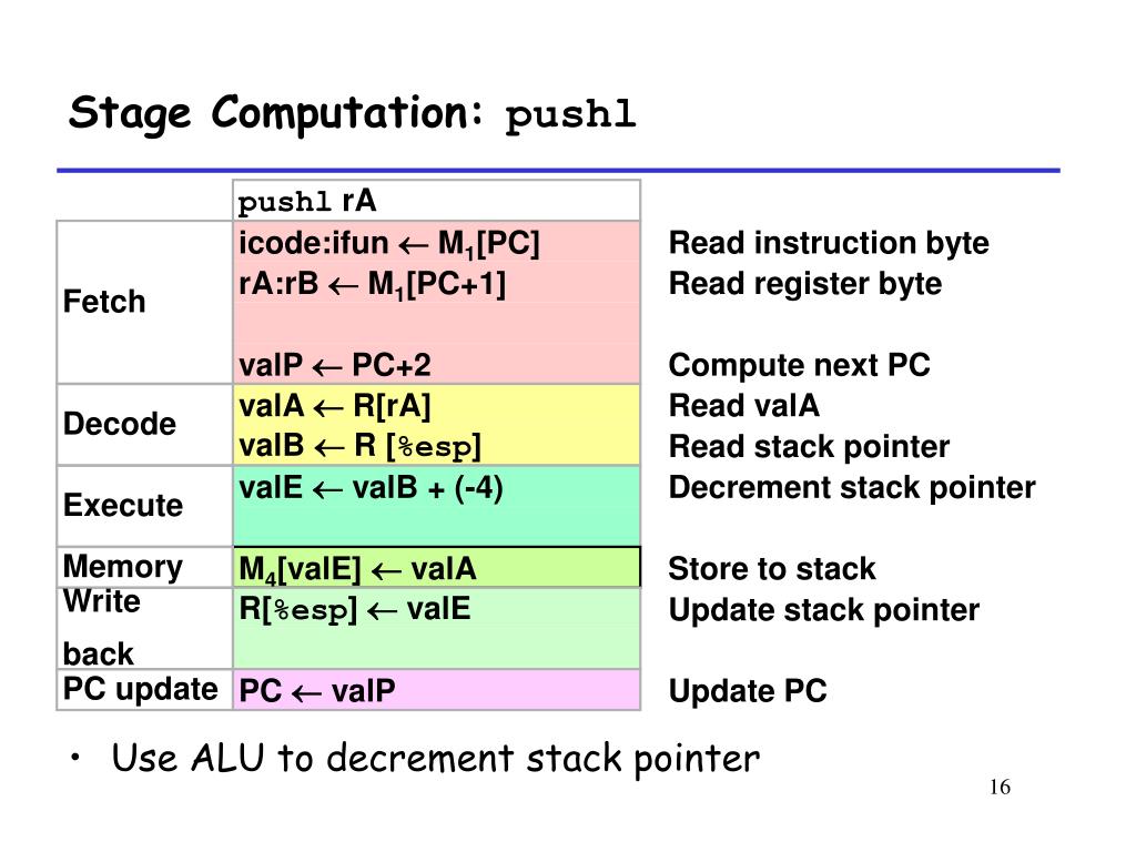 Fetch Read 2 bytes Decode Read stack pointer and register rA Execute Decrement stack pointer by 4 Memory Store valA at the address of new stack pointer Write back Update stack pointer PC Update Increment PC by 2 pushl rA a rA 0 F Executing pushl