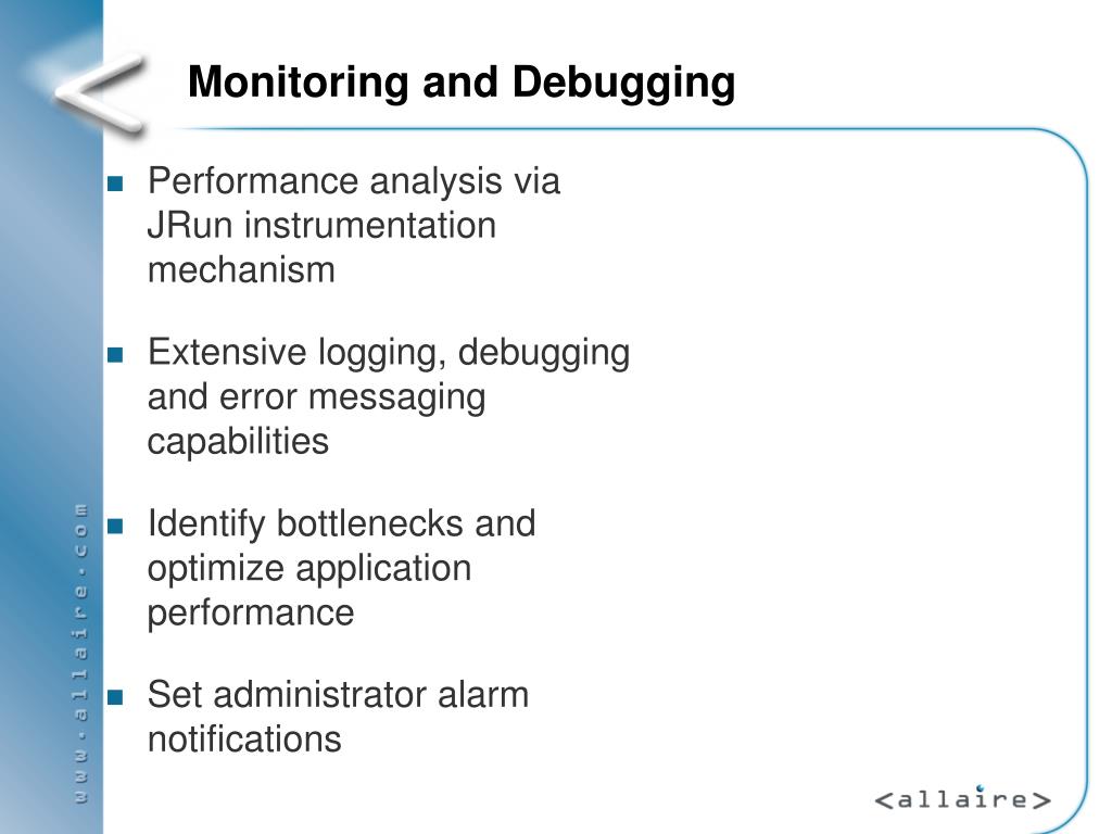 Performance analysis via JRun instrumentation mechanism Extensive logging, debugging and error messaging capabilities Identify bottlenecks and optimize application performance Set administrator alarm notifications Monitoring and Debugging