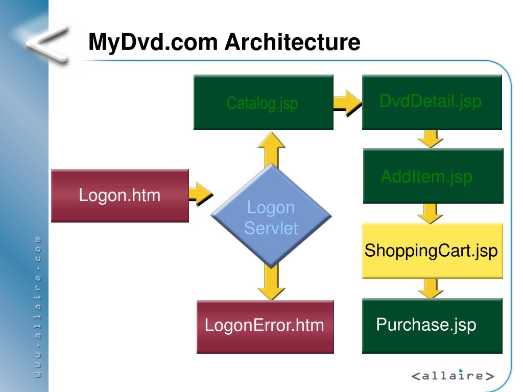 MyDvd.com Architecture Catalog.jsp DvdDetail.jsp AddItem.jsp Logon.htm LogonServlet ShoppingCart.jsp Purchase.jsp LogonError.htm