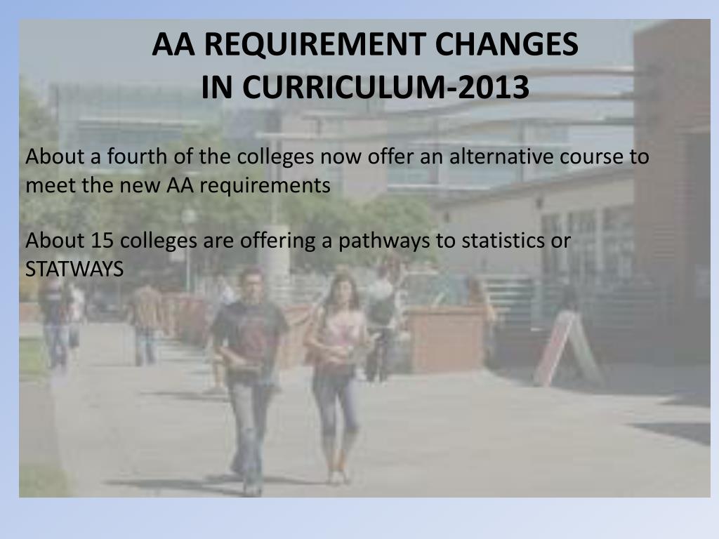 AA REQUIREMENT CHANGES IN CURRICULUM-2013 About a fourth of the colleges now offer an alternative course to meet the new AA requirements About 15 colleges are offering a pathways to statistics or STATWAYS