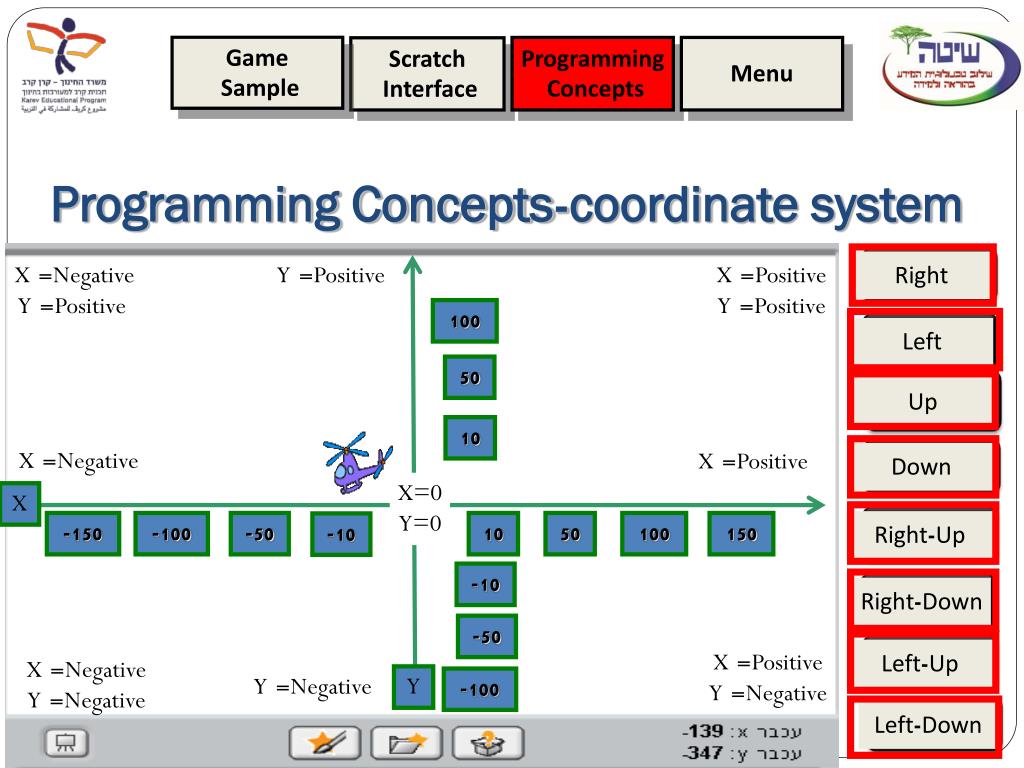 Down Right-Up Left-Up Up Left Right Right-Down Left-Down 100 50 10 150- 100- 50- 10 50 100 150 10- 10- 50- 100- Programming Concepts-coordinate system Game Sample Programming Concepts Menu Scratch Interface X= Negative Y= Positive X= Positive Y= Positive Y= Positive X= Negative X= Positive X=0 Y=0 X X= Positive Y= Negative X= Negative Y= Negative Y= Negative Y