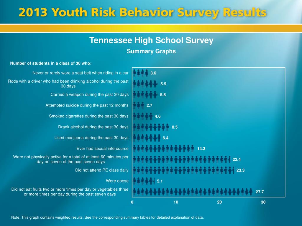 Tennessee High School Survey Summary Graphs Number of students in a class of 30 who: Note: This graph contains weighted results. See the corresponding summary tables for detailed explanation of data.