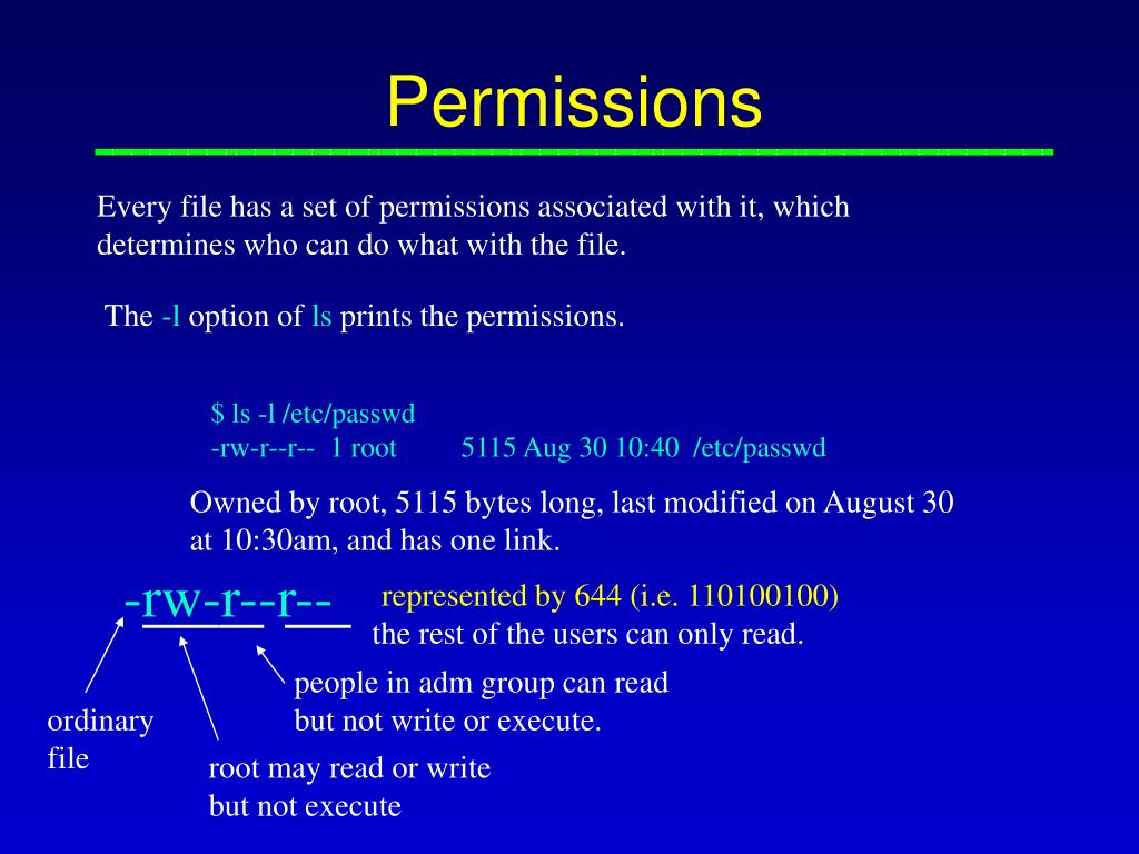 Permissions Every file has a set of permissions associated with it, which determines who can do what with the file. The -l option of ls prints the permissions. $ ls -l /etc/passwd -rw-r--r-- 1 root 5115 Aug 30 10:40 /etc/passwd Owned by root, 5115 bytes long, last modified on August 30 at 10:30am, and has one link. -rw-r--r-- represented by 644 (i.e. 110100100) the rest of the users can only read. people in adm group can read but not write or execute. ordinary file root may read or write but not execute