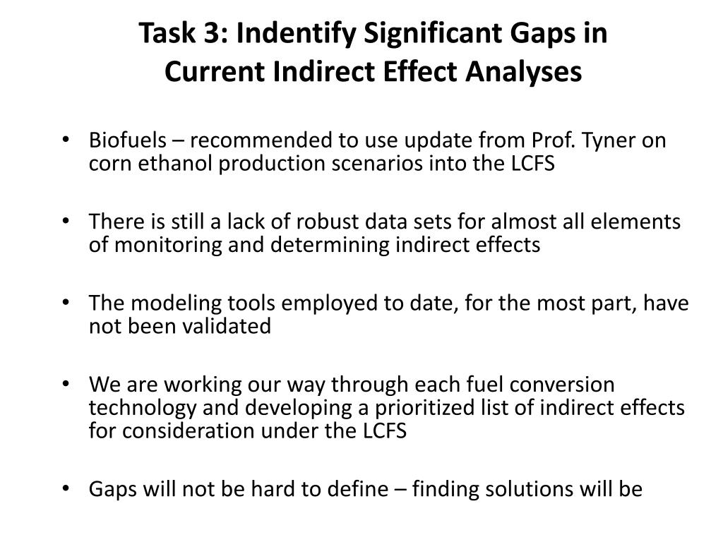 Task 3: Indentify Significant Gaps in Current Indirect Effect Analyses • Biofuels – recommended to use update from Prof. Tyner on corn ethanol production scenarios into the LCFS • There is still a lack of robust data sets for almost all elements of monitoring and determining indirect effects • The modeling tools employed to date, for the most part, have not been validated • We are working our way through each fuel conversion technology and developing a prioritized list of indirect effects for consideration under the LCFS • Gaps will not be hard to define – finding solutions will be