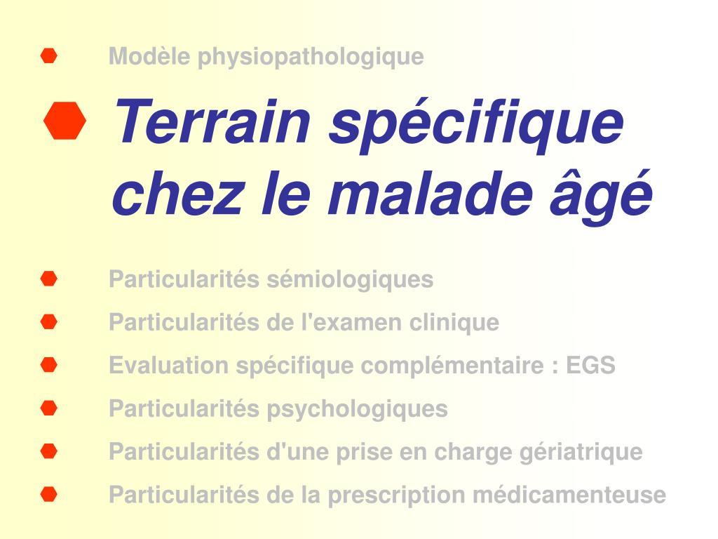 Modèle physiopathologique Terrain spécifique chez le malade âgé Particularités sémiologiques Particularités de l'examen clinique Evaluation spécifique complémentaire : EGS Particularités psychologiques Particularités d'une prise en charge gériatrique Particularités de la prescription médicamenteuse