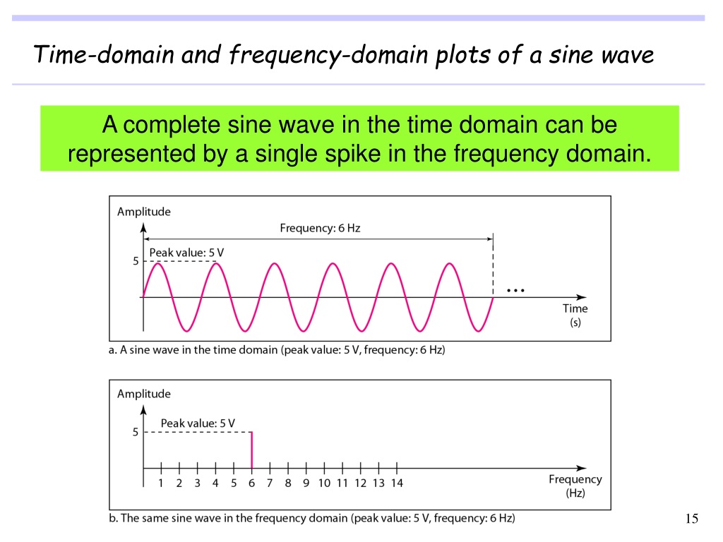 Time-domain and frequency-domain plots of a sine wave A complete sine wave in the time domain can be represented by a single spike in the frequency domain.