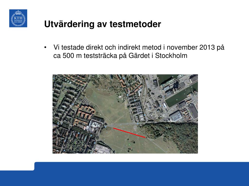 Utvärdering av testmetoder • Vi testade direkt och indirekt metod i november 2013 på ca 500 m teststräcka på Gärdet i Stockholm