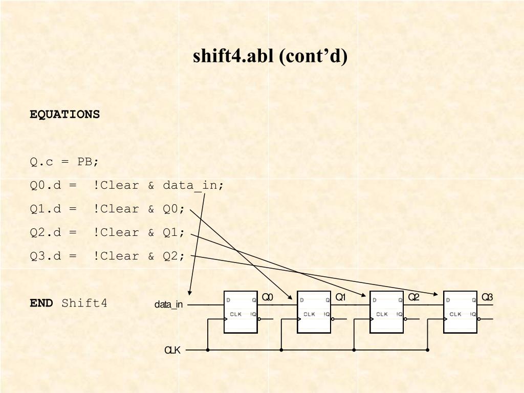 shift4.abl (cont’d) EQUATIONS Q.c = PB; Q0.d = !Clear & data_in; Q1.d = !Clear & Q0; Q2.d = !Clear & Q1; Q3.d = !Clear & Q2; END Shift4