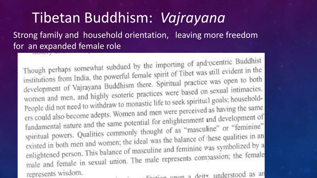 Tibetan Buddhism: Vajrayana Strong family and household orientation, leaving more freedom for an expanded female role