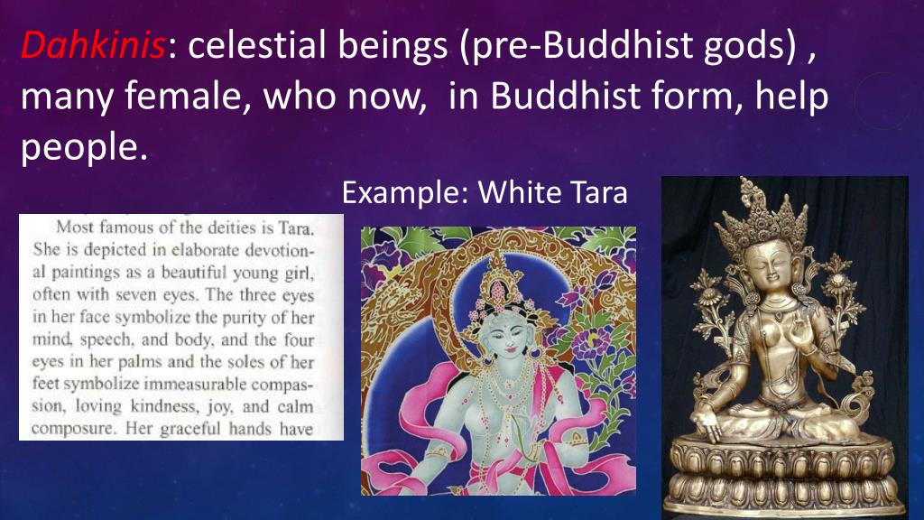 Dahkinis: celestial beings (pre-Buddhist gods) , many female, who now, in Buddhist form, help people. Example: White Tara