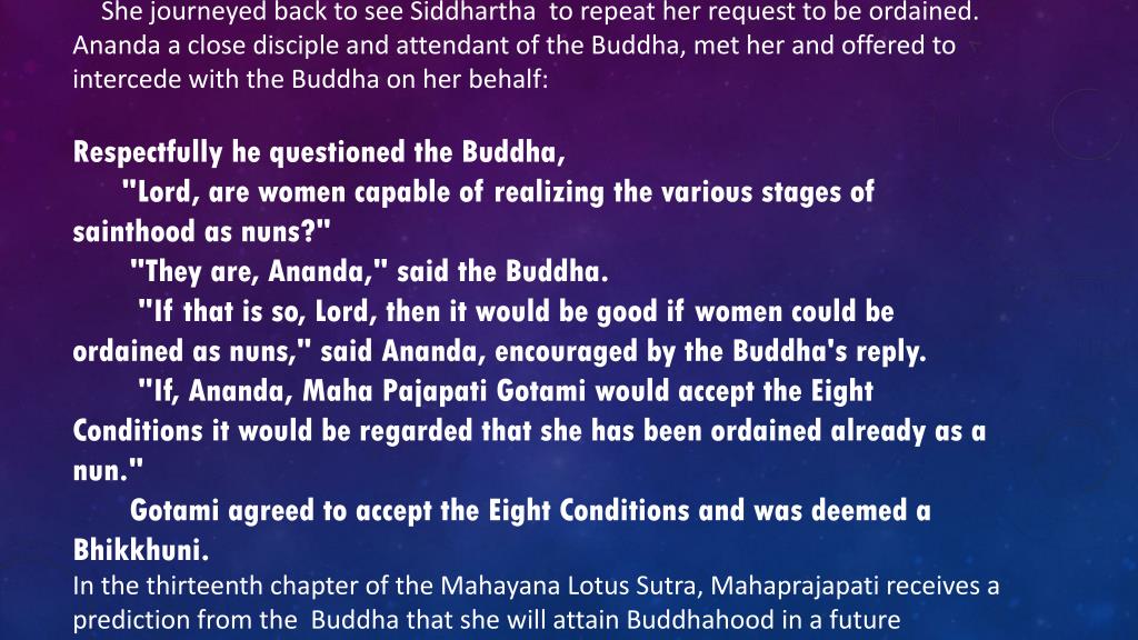 She journeyed back to see Siddhartha to repeat her request to be ordained. Ananda a close disciple and attendant of the Buddha, met her and offered to intercede with the Buddha on her behalf: Respectfully he questioned the Buddha, "Lord, are women capable of realizing the various stages of sainthood as nuns?" "They are, Ananda," said the Buddha. "If that is so, Lord, then it would be good if women could be ordained as nuns," said Ananda, encouraged by the Buddha's reply. "If, Ananda, MahaPajapatiGotami would accept the Eight Conditions it would be regarded that she has been ordained already as a nun." Gotami agreed to accept the Eight Conditions and was deemed a Bhikkhuni. In the thirteenth chapter of the Mahayana Lotus Sutra, Mahaprajapati receives a prediction from the Buddha that she will attain Buddhahood in a future lifetime.