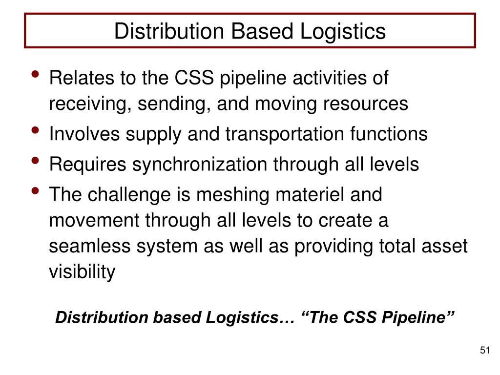 Distribution Based Logistics • Relates to the CSS pipeline activities of receiving, sending, and moving resources • Involves supply and transportation functions • Requires synchronization through all levels • The challenge is meshing materiel and movement through all levels to create a seamless system as well as providing total asset visibility Distribution based Logistics… “The CSS Pipeline”