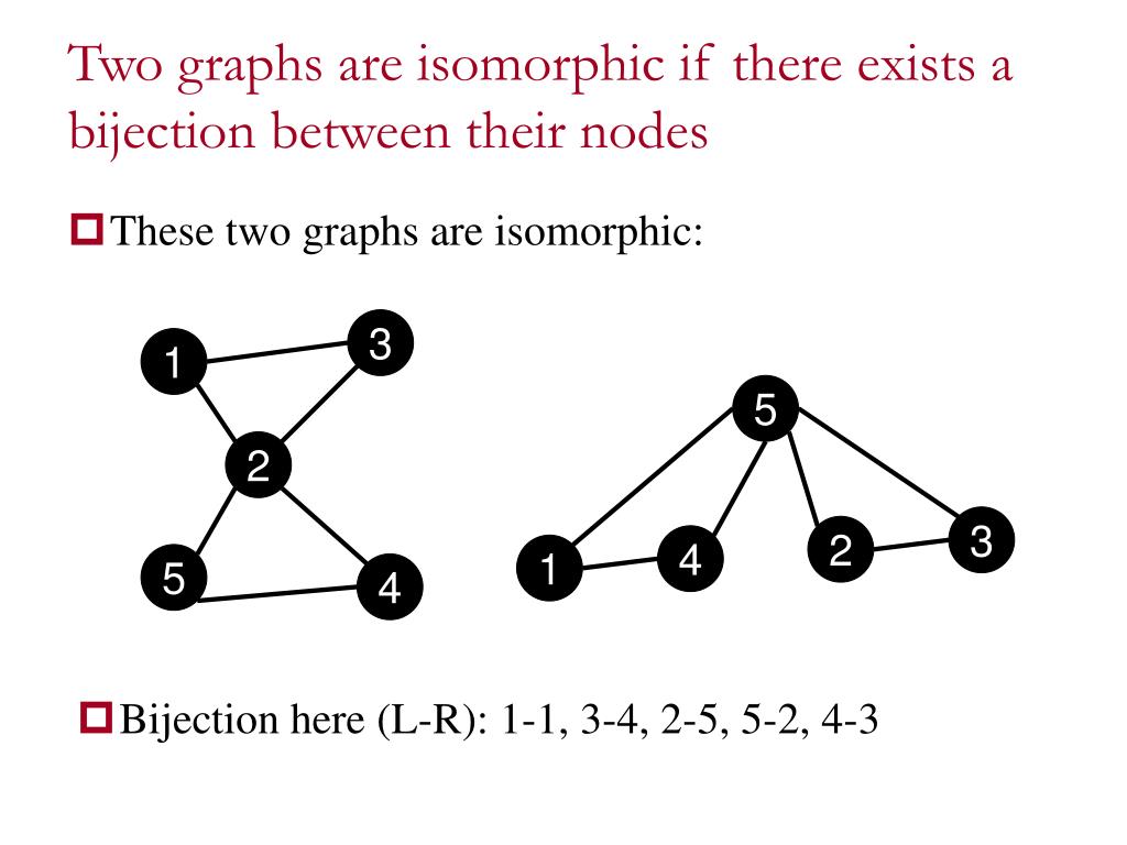 Two graphs are isomorphic if there exists a bijection between their nodes • These two graphs are isomorphic: 3 1 5 2 3 2 4 1 5 4 • Bijection here (L-R): 1-1, 3-4, 2-5, 5-2, 4-3