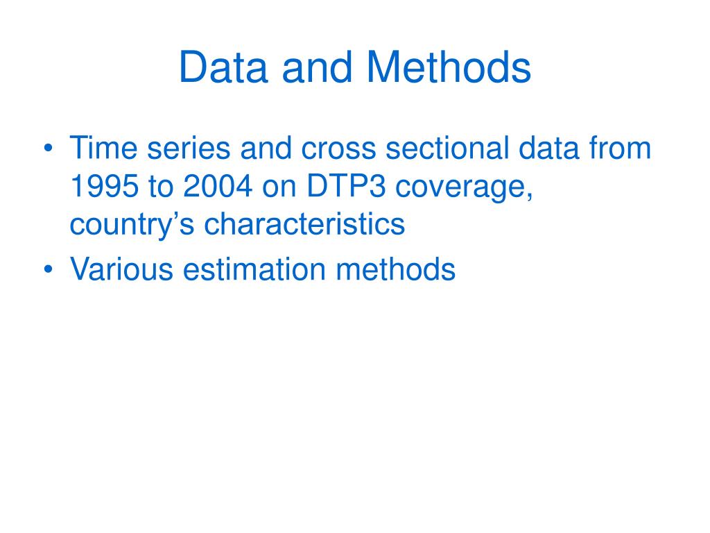 Data and Methods • Time series and cross sectional data from 1995 to 2004 on DTP3 coverage, country’s characteristics • Various estimation methods