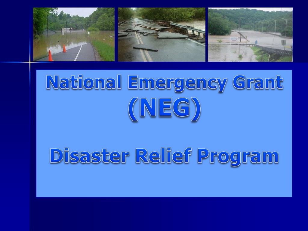 National Emergency Grant (NEG) Disaster Relief Program. PROGRAM OVERVIEW. The National Emergency Grant (NEG) Disaster Relief Program provides temporary jobs to assist in the clean-up and restoration efforts as a result of the May 2010 floods.