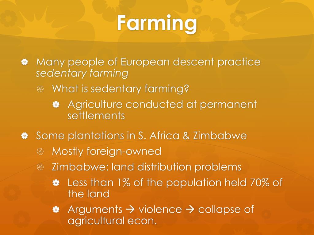 Farming • Many people of European descent practice sedentary farming • What is sedentary farming? • Agriculture conducted at permanent settlements • Some plantations in S. Africa & Zimbabwe • Mostly foreign-owned • Zimbabwe: land distribution problems • Less than 1% of the population held 70% of the land • Arguments violence collapse of agricultural econ.