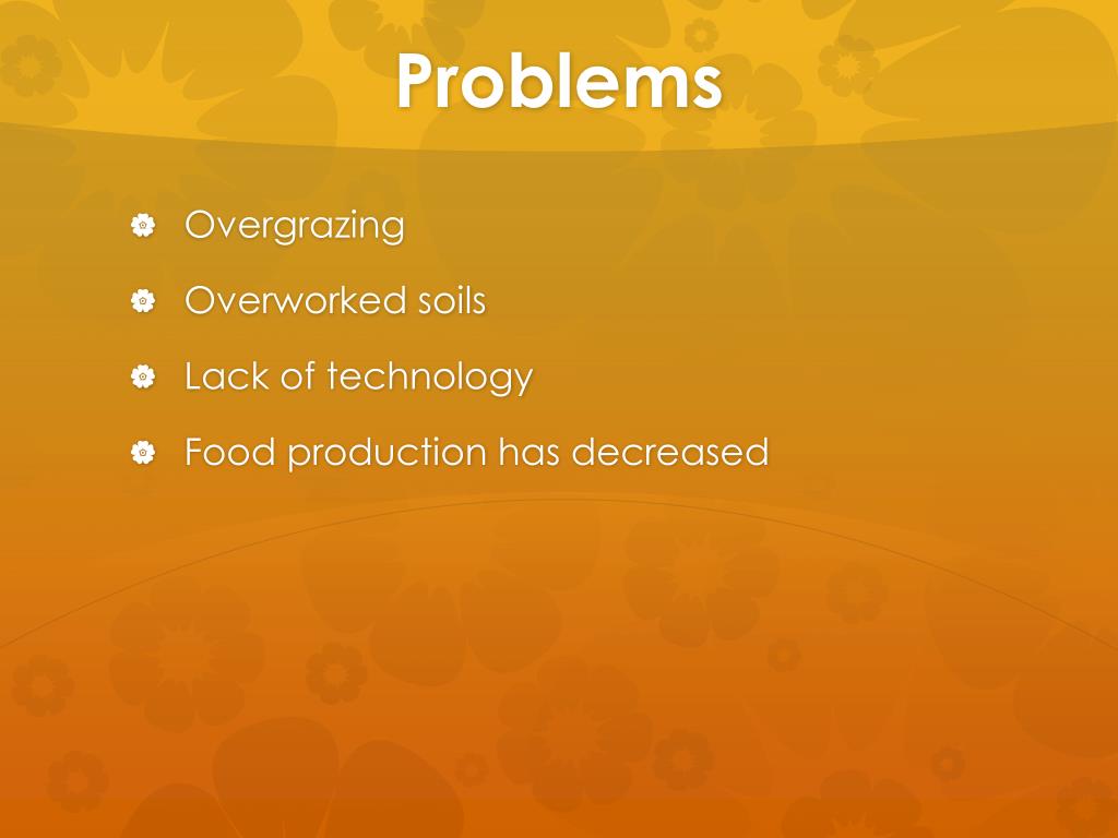 Problems • Overgrazing • Overworked soils • Lack of technology • Food production has decreased