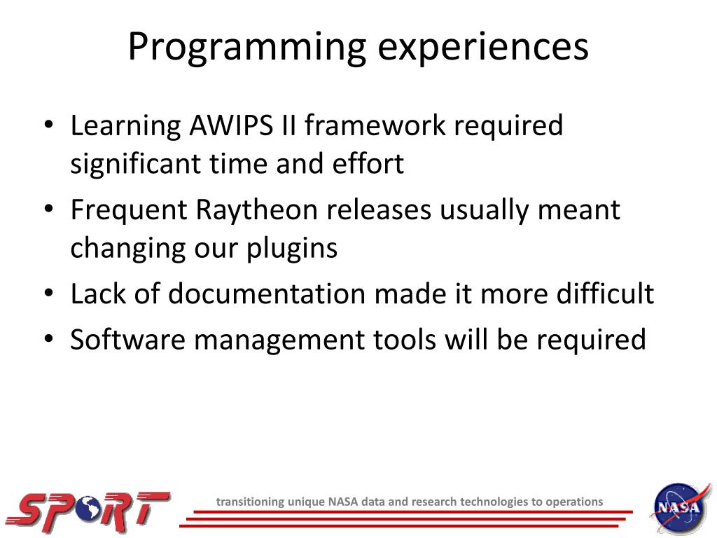 Programming experiences Learning AWIPS II framework required significant time and effort Frequent Raytheon releases usually meant changing our plugins Lack of documentation made it more difficult Software management tools will be required