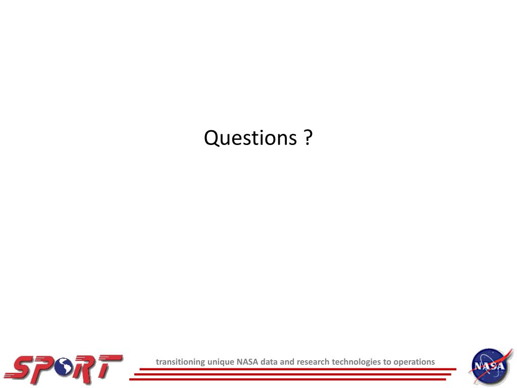 Future Work • Complete creation of plugins, colormaps, menus, bundles for all current AWIPS I SPoRT products • Create and/or extend plugins for upcoming datasets • Improve RGB with true 24-bit visualization • 3D visualization efforts • Multi-byte datasets