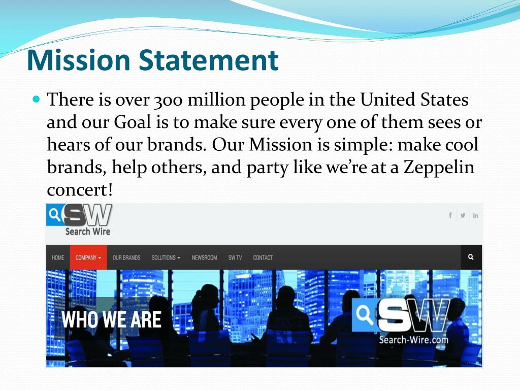 Mission Statement • There is over 300 million people in the United States and our Goal is to make sure every one of them sees or hears of our brands. Our Mission is simple: make cool brands, help others, and party like we’re at a Zeppelin concert!