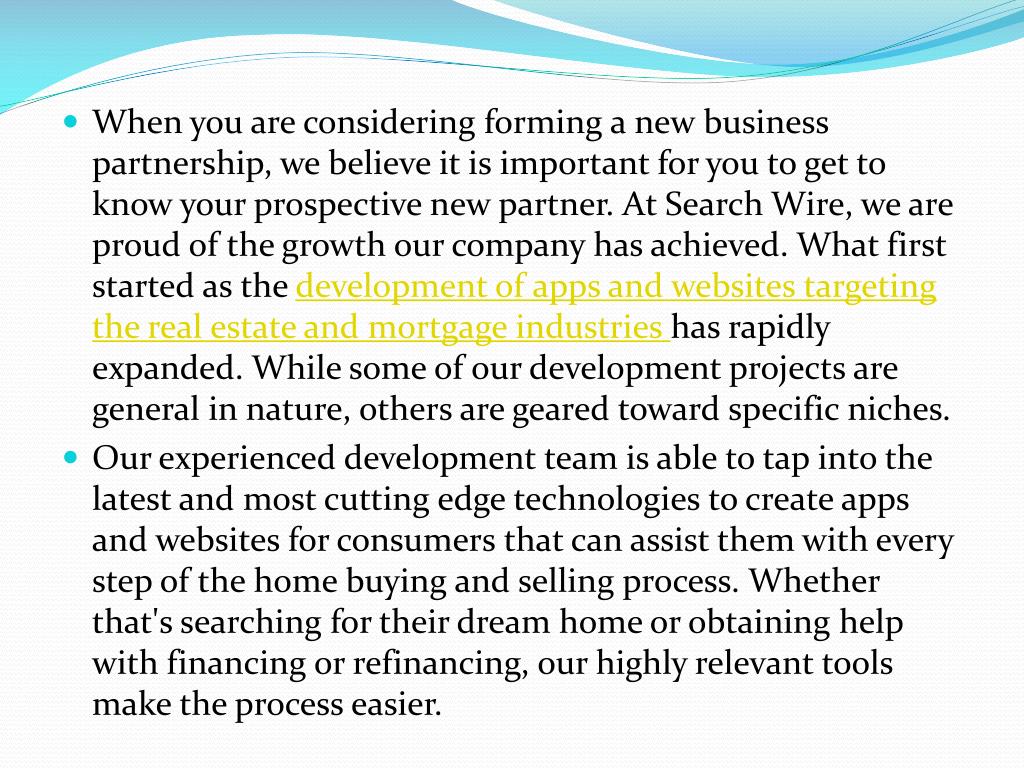 When you are considering forming a new business partnership, we believe it is important for you to get to know your prospective new partner. At Search Wire, we are proud of the growth our company has achieved. What first started as the development of apps and websites targeting the real estate and mortgage industries has rapidly expanded. While some of our development projects are general in nature, others are geared toward specific niches. • Our experienced development team is able to tap into the latest and most cutting edge technologies to create apps and websites for consumers that can assist them with every step of the home buying and selling process. Whether that's searching for their dream home or obtaining help with financing or refinancing, our highly relevant tools make the process easier.