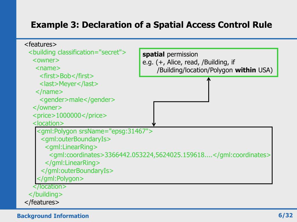 Example 3: Declaration of a Spatial Access Control Rule <features> <building classification="secret"> <owner> <name> <first>Bob</first> <last>Meyer</last> </name> <gender>male</gender> </owner> <price>1000000</price> <location> <gml:Polygon srsName="epsg:31467"> <gml:outerBoundaryIs> <gml:LinearRing> <gml:coordinates>3366442.053224,5624025.159618....</gml:coordinates> </gml:LinearRing> </gml:outerBoundaryIs> </gml:Polygon> </location> </building> </features> spatial permissione.g. (+, Alice, read, /Building, if /Building/location/Polygon within USA) BackgroundInformation