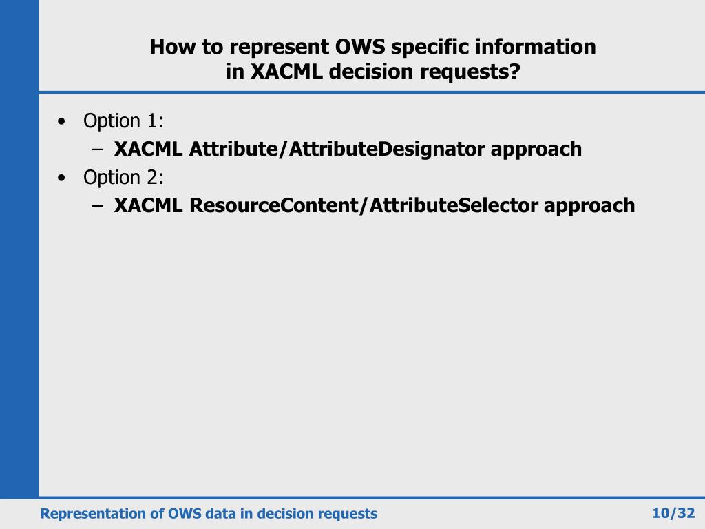 How to represent OWS specific information in XACML decision requests? • Option 1: • XACMLAttribute/AttributeDesignator approach • Option 2: • XACMLResourceContent/AttributeSelector approach Representation of OWS data in decision requests