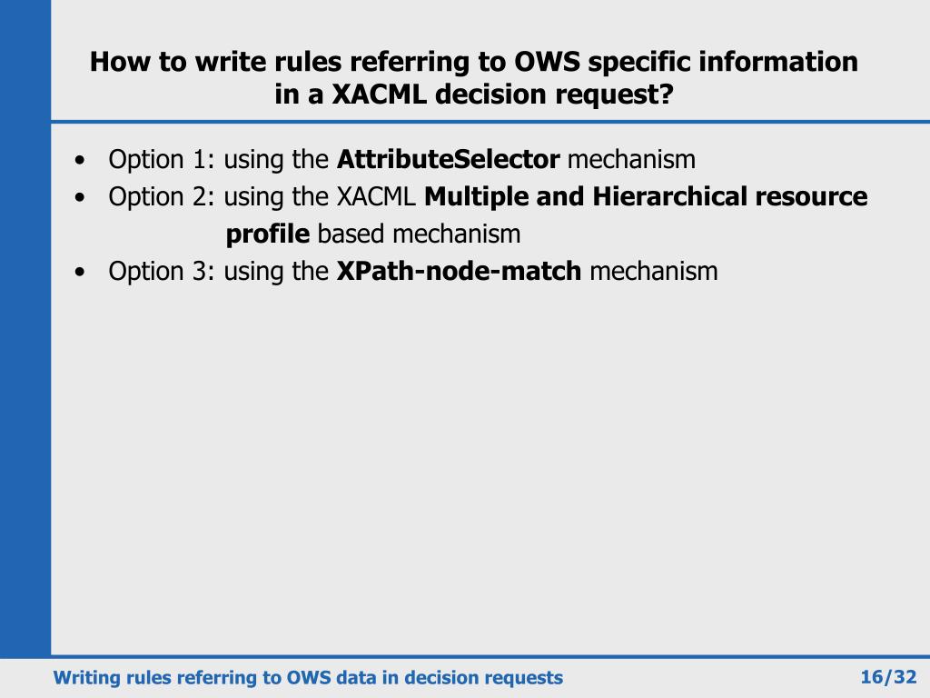How to write rules referring to OWS specific information in a XACML decision request? • Option 1: using the AttributeSelector mechanism • Option 2: using the XACML Multiple and Hierarchical resource profile based mechanism • Option 3: using the XPath-node-match mechanism Writing rules referring to OWS data in decision requests