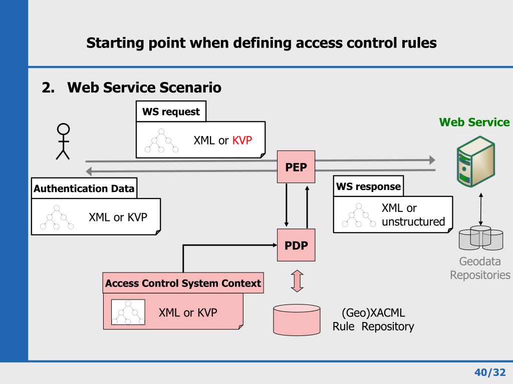 Authentication Data WS request WS response XML or unstructured XML or KVP XML or KVP Geodata Repositories Access Control System Context XML or KVP Starting point when defining access control rules • Web Service Scenario Web Service PEP PDP (Geo)XACML Rule Repository