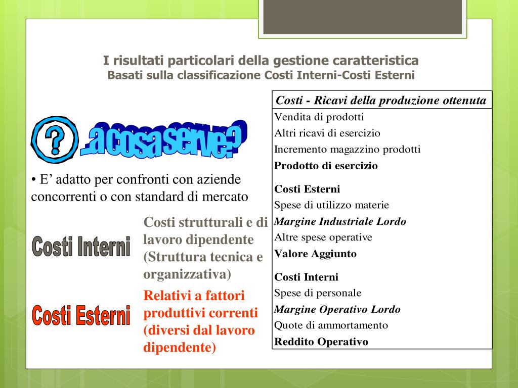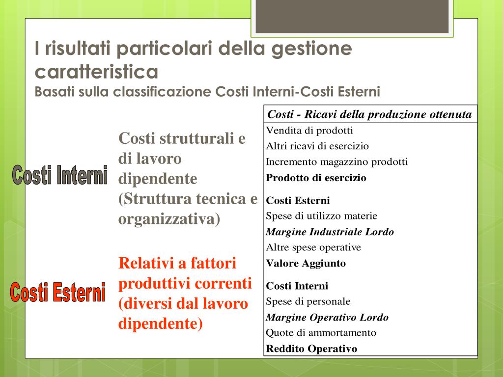 I risultati particolari della gestione caratteristicaBasati sulla classificazione Costi Interni-Costi Esterni Costi strutturali e di lavoro dipendente (Struttura tecnica e organizzativa) Costi Interni Relativi a fattori produttivi correnti (diversi dal lavoro dipendente) Costi Esterni