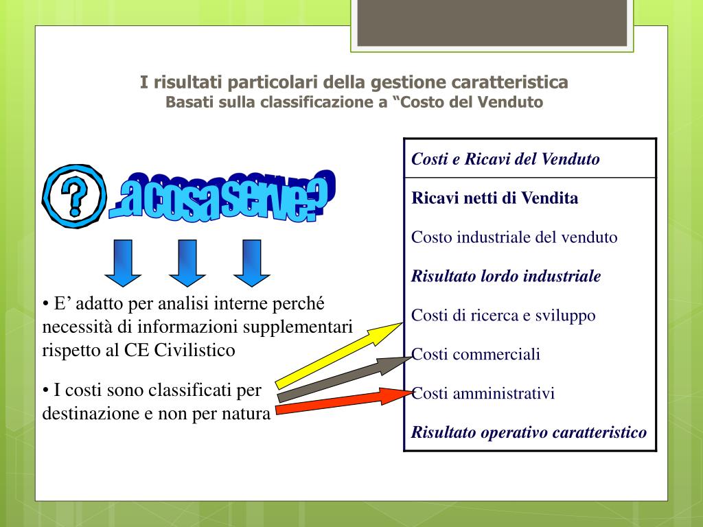 I risultati particolari della gestione caratteristicaBasati sulla classificazione a “Costo del Venduto ...a cosa serve? • E’ adatto per analisi interne perché necessità di informazioni supplementari rispetto al CE Civilistico • I costi sono classificati per destinazione e non per natura
