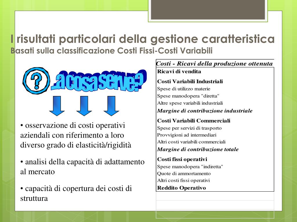 I risultati particolari della gestione caratteristicaBasati sulla classificazione Costi Fissi-Costi Variabili ...a cosa serve? • osservazione di costi operativi aziendali con riferimento a loro diverso grado di elasticità/rigidità • analisi della capacità di adattamento al mercato • capacità di copertura dei costi di struttura