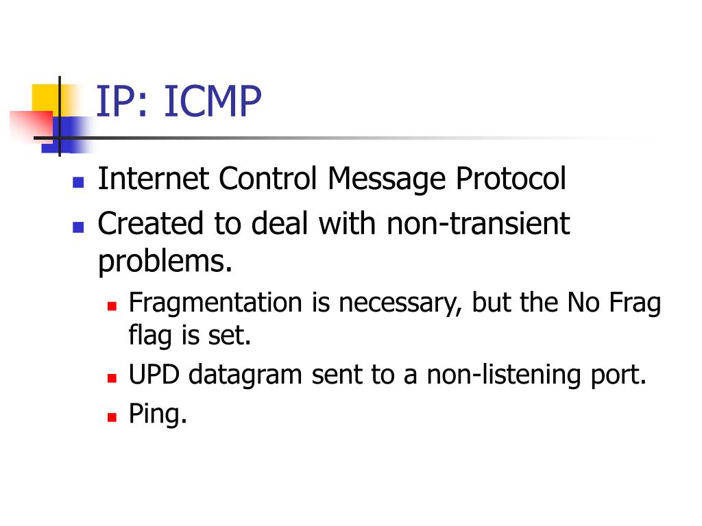 IP: ICMP • Internet Control Message Protocol • Created to deal with non-transient problems. • Fragmentation is necessary, but the No Frag flag is set. • UPD datagram sent to a non-listening port. • Ping.