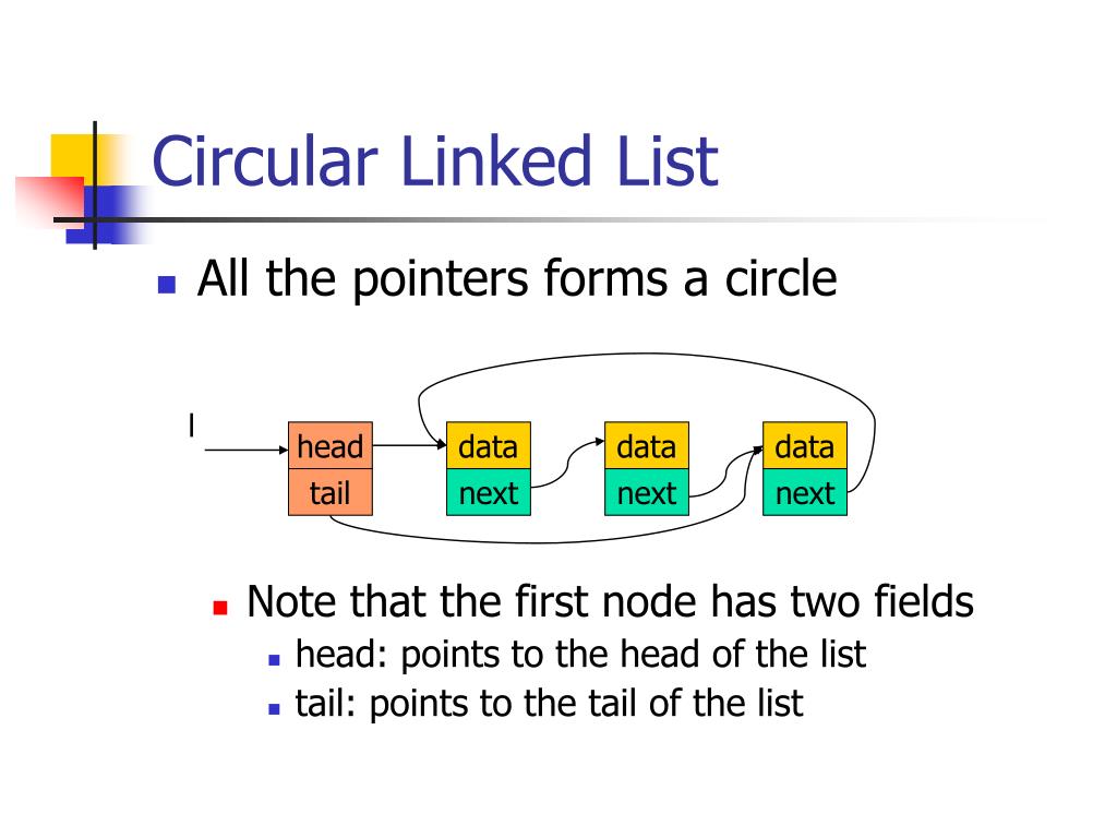 head data data data tail next next next Circular Linked List • All the pointers forms a circle • Note that the first node has two fields • head: points to the head of the list • tail: points to the tail of the list l