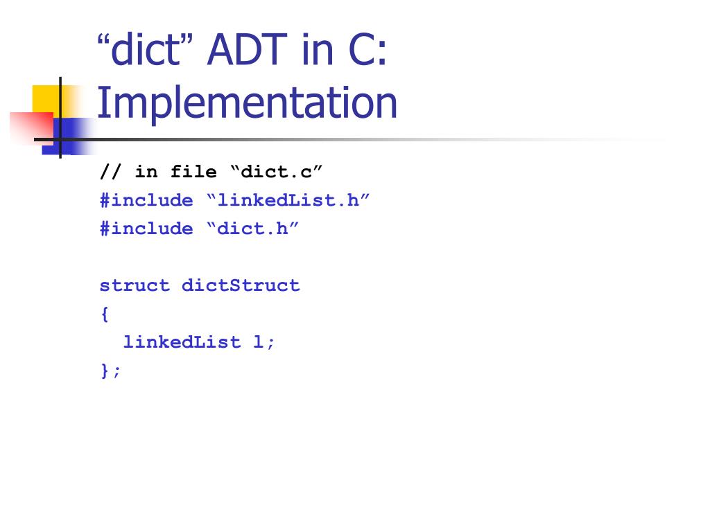 “dict” ADT in C: Implementation // in file “dict.c” #include “linkedList.h” #include “dict.h” struct dictStruct { linkedList l; };