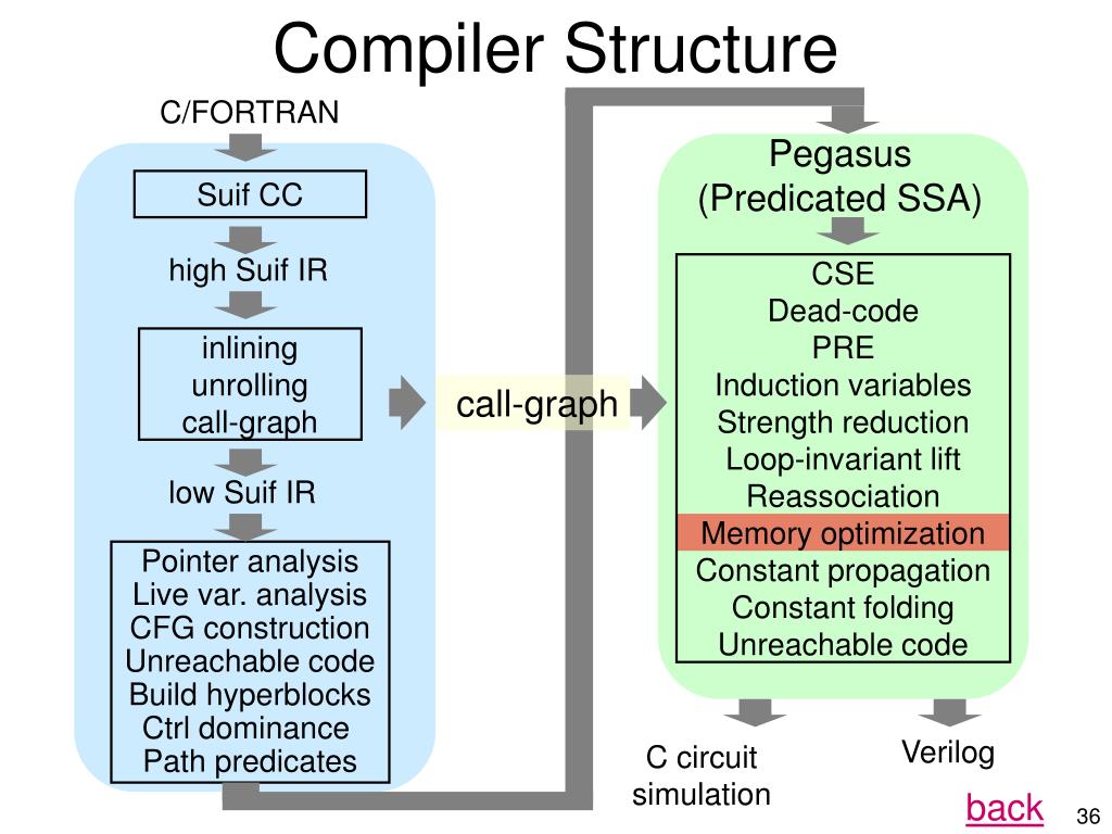 Compiler Structure C/FORTRAN Pegasus(Predicated SSA) Suif CC high Suif IR CSE Dead-code PRE Induction variables Strength reduction Loop-invariant lift Reassociation Memory optimization Constant propagation Constant folding Unreachable code inlining unrolling call-graph call-graph low Suif IR Pointer analysis Live var. analysis CFG construction Unreachable code Build hyperblocks Ctrl dominance Path predicates Verilog C circuitsimulation back