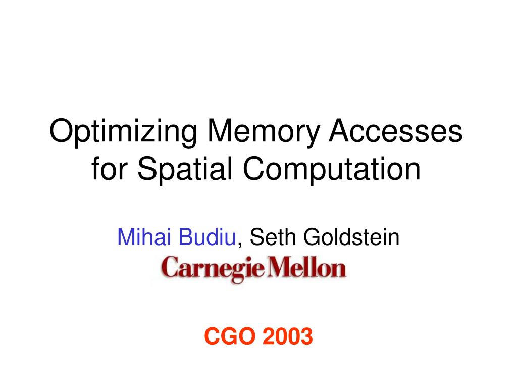 Optimizing Memory Accesses for Spatial Computation. Mihai Budiu , Seth Goldstein CGO 2003. Optimizing Memory Accesses for Spatial Computation. Program. Compiler. This work. Why at CGO?. C. Predicated IR. Optimized IR. Optimizing Memory Accesses for Spatial Computation. =*q. *p=.