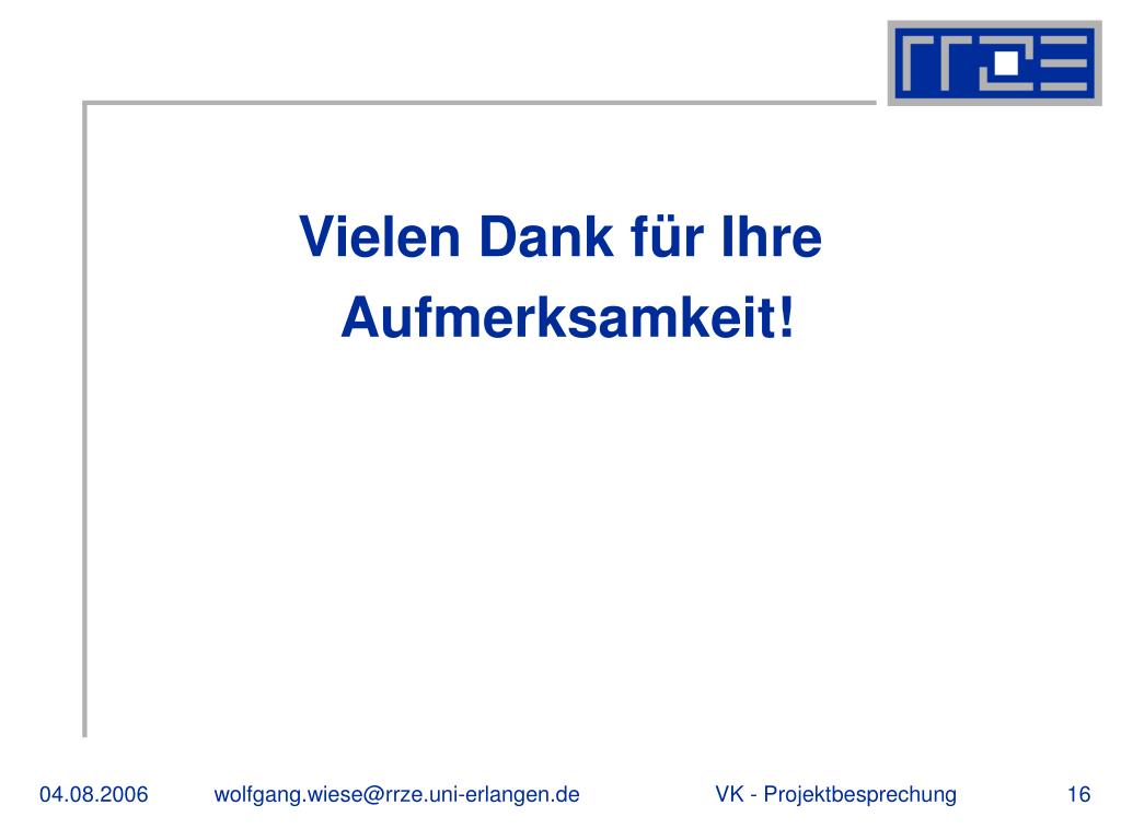 Danke! Vielen Dank für Ihre Aufmerksamkeit! wolfgang.wiese@rrze.uni-erlangen.de