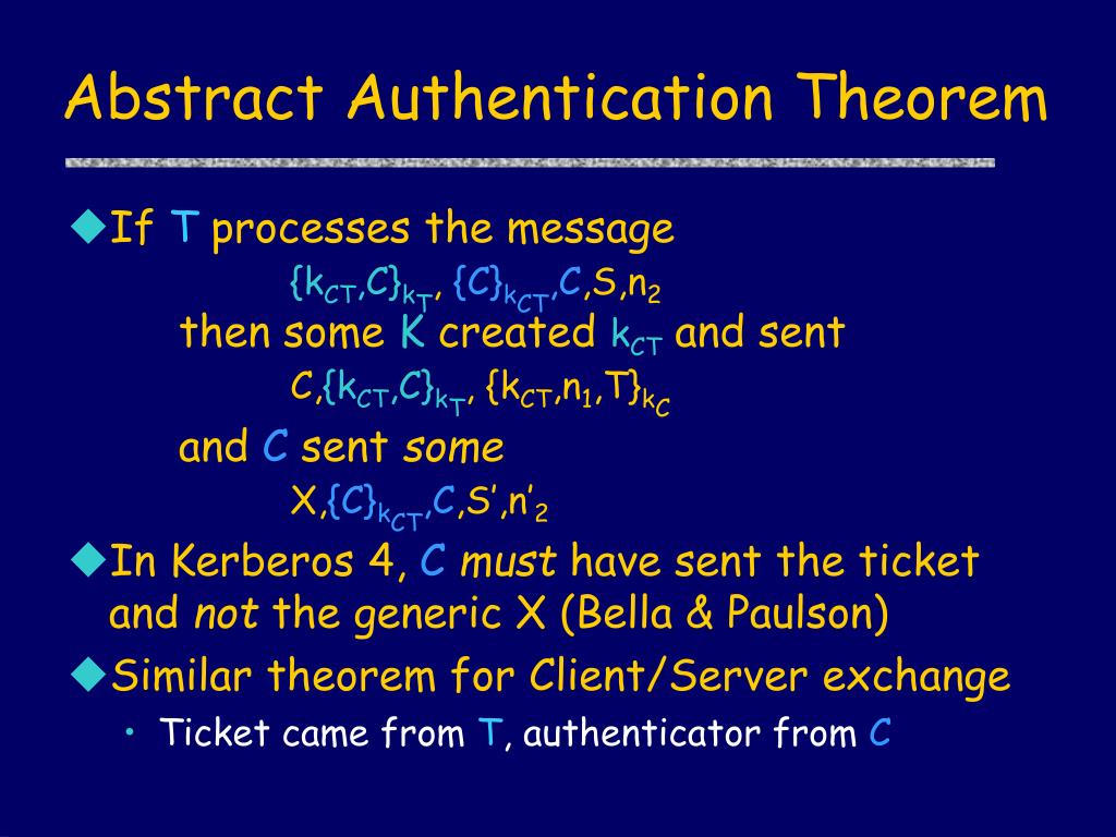 Abstract Authentication Theorem • If T processes the message {kCT,C}kT, {C}kCT,C,S,n2 then some K created kCT and sent C,{kCT,C}kT, {kCT,n1,T}kC and C sent someX,{C}kCT,C,S’,n’2 • In Kerberos 4, Cmust have sent the ticket and not the generic X (Bella & Paulson) • Similar theorem for Client/Server exchange • Ticket came from T, authenticator from C