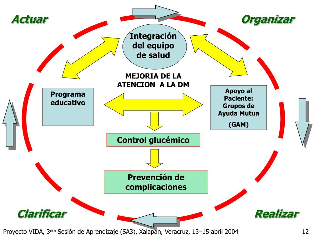 Actuar Organizar Integración del equipo de salud MEJORIA DE LA ATENCION A LA DM Apoyo al Paciente: Grupos de Ayuda Mutua (GAM) Programa educativo Control glucémico Prevención de complicaciones Clarificar Realizar Proyecto VIDA, 3era Sesión de Aprendizaje (SA3), Xalapan, Veracruz, 13–15 abril 2004