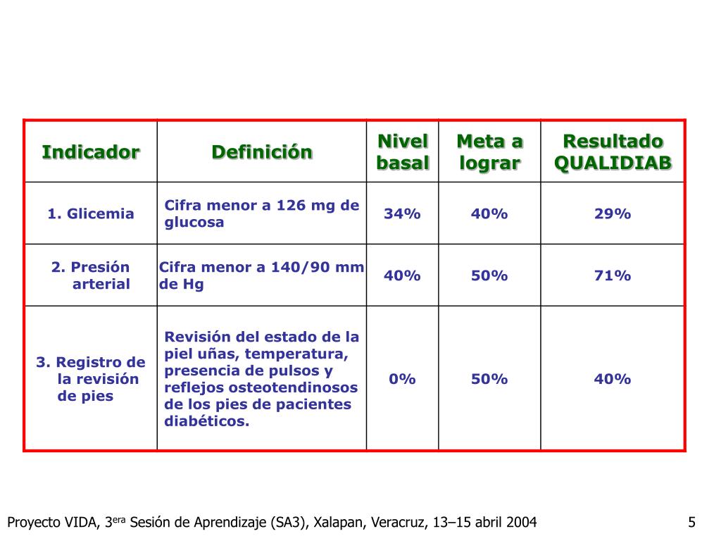 Propuesta de Plan de Intervención • Seguir los protocolos establecidos en la Norma Oficial Mexicana de Diabetes. • Realizar un esfuerzo para que todos los pacientes alcancen un índice glucémico adecuado. • Todos los pacientes establecerán objetivos de tratamiento junto al médico. • Todos los pacientes deberán ser evaluados por la nutricionista. Proyecto VIDA, 3era Sesión de Aprendizaje (SA3), Xalapan, Veracruz, 13–15 abril 2004