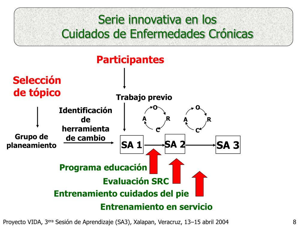 Serie innovativa en los Cuidados de Enfermedades Crónicas Participantes Selección de tópico Trabajo previo O O Identificación de herramienta de cambio A R A R C C Grupo de planeamiento SA 2 SA 1 SA 3 Programa educación Evaluación SRC Entrenamiento cuidados del pie Entrenamiento en servicio Proyecto VIDA, 3era Sesión de Aprendizaje (SA3), Xalapan, Veracruz, 13–15 abril 2004
