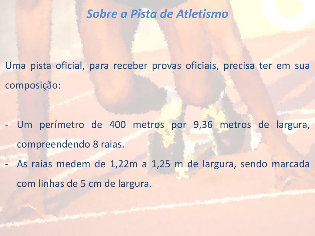 Sobre a Pista de Atletismo • Uma pista oficial, para receber provas oficiais, precisa ter em sua composição: • Um perímetro de 400 metros por 9,36 metros de largura, compreendendo 8 raias. • As raias medem de 1,22m a 1,25 m de largura, sendo marcada com linhas de 5 cm de largura.
