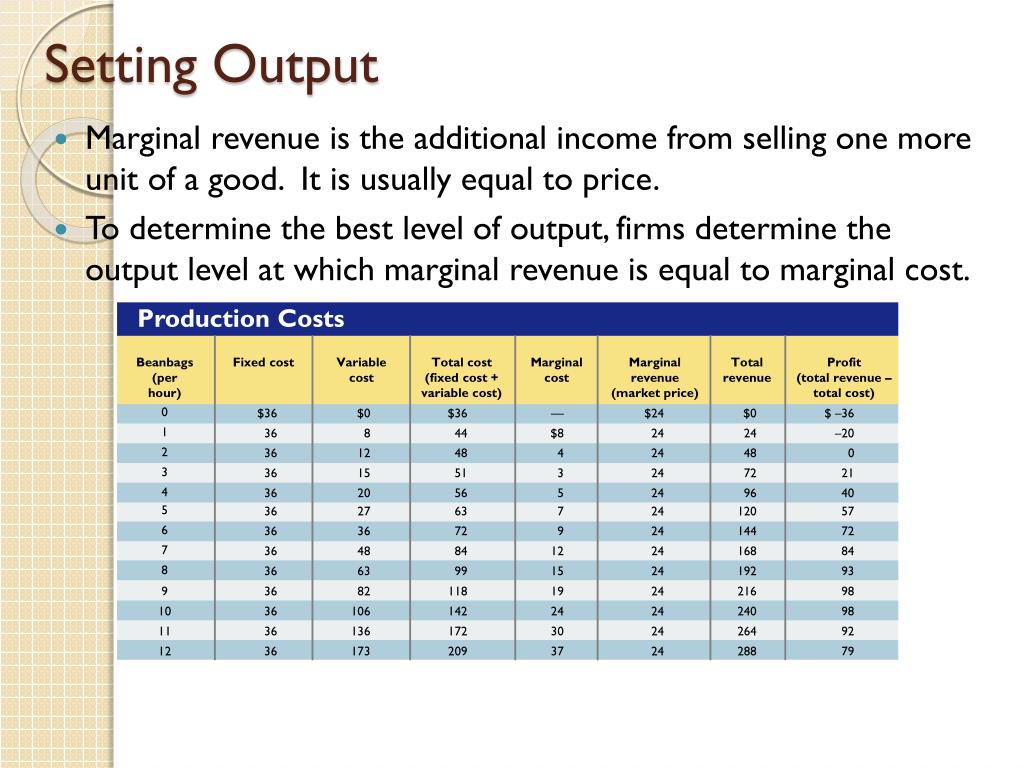 Production Costs Beanbags (per hour) Fixed cost Variable cost Total cost (fixed cost + variable cost) Marginal cost Marginal revenue (market price) Total revenue Profit(total revenue – total cost) 0 1 2 3 4 $36 36 36 36 36 $0 8 12 15 20 $36 44 48 51 56 — $8 4 3 5 $24 24 24 24 24 $0 24 48 72 96 $ –36 –20 0 21 40 5 6 7 8 36 36 36 36 27 36 48 63 63 72 84 99 7 9 12 15 24 24 24 24 120 144 168 192 57 72 84 93 9 10 11 12 36 36 36 36 82 106 136 173 118 142 172 209 19 24 30 37 24 24 24 24 216 240 264 288 98 98 92 79 Setting Output • Marginal revenue is the additional income from selling one more unit of a good. It is usually equal to price. • To determine the best level of output, firms determine the output level at which marginal revenue is equal to marginal cost.