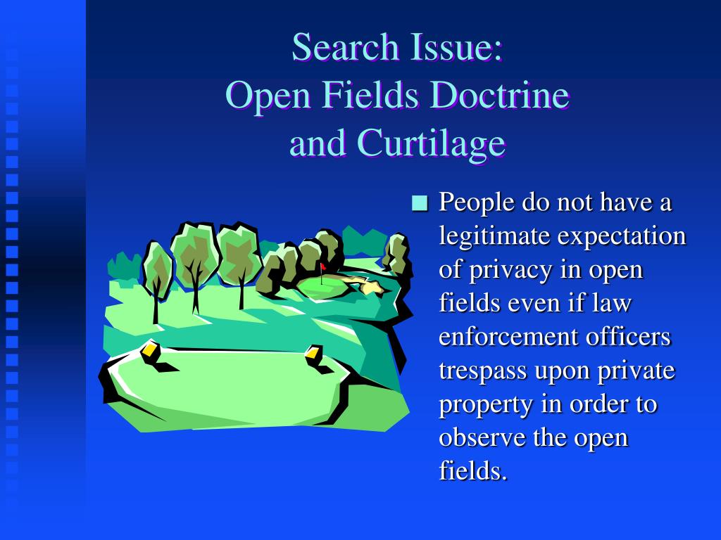 Search Issue:Open Fields Doctrineand Curtilage • People do not have a legitimate expectation of privacy in open fields even if law enforcement officers trespass upon private property in order to observe the open fields.