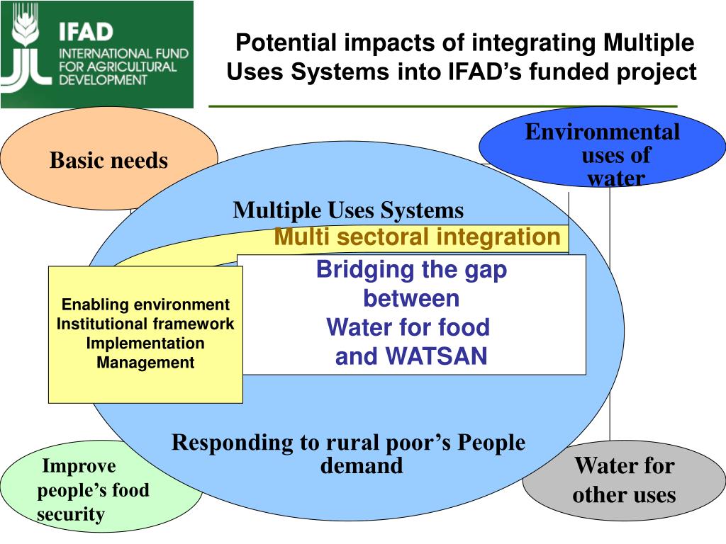 Basic needs Environmental uses of water Multiple Uses Systems Responding to rural poor’s People demand Alleviate poverty for PEOPLE Improve people’s food security Water for other uses Potential impacts of integrating Multiple Uses Systems into IFAD’s funded project Multi sectoral integration Bridging the gap between Water for food and WATSAN Enabling environment Institutional framework Implementation Management